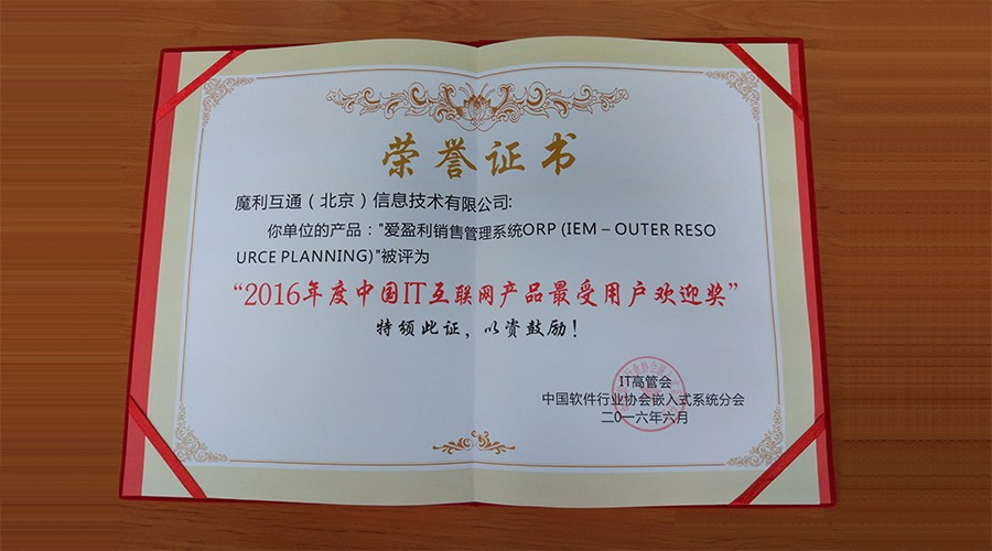 2016年6月18日,在IT高管會(huì)舉辦的2016年中國(guó)IT互聯(lián)網(wǎng)產(chǎn)品創(chuàng)新論壇上,魔利互通(北京)信息技術(shù)有限公司的愛(ài)盈利銷售管理系統(tǒng)ORP(IEM-OUTER RESOURCE PLANNING)經(jīng)過(guò)網(wǎng)絡(luò)票選和專家評(píng)選兩個(gè)環(huán)節(jié),最終獲得“最受用戶歡迎獎(jiǎng)”。